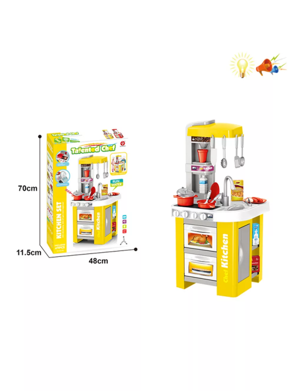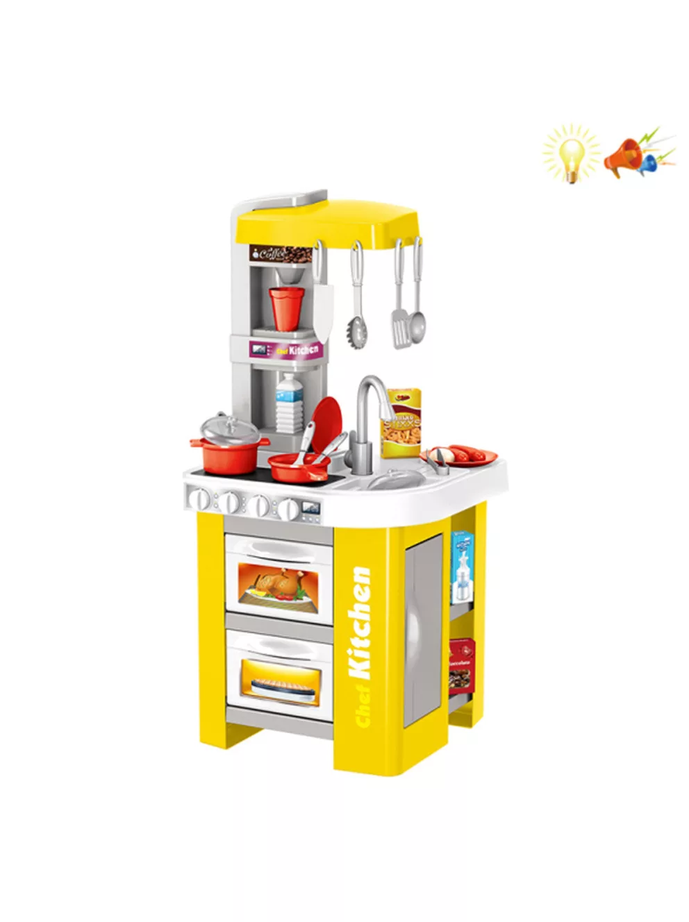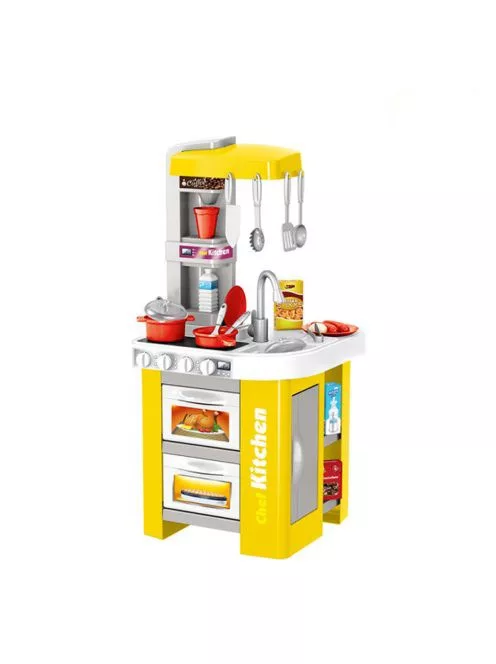 Кухня разполага с две фурни с отварящи се вратички, два хладилника с отварящи се вратички, два котлона, които се включват от четири копчета и издават реалистични готварски звуци и светят, създавайки илюзия в детето, че то наистина готви.